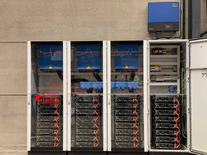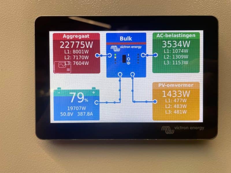 The three phase system employs 3 x Quattro 15kVA Inverter Chargers together with Pylontech storage and is controlled by a Cerbo GX. Also in the build: