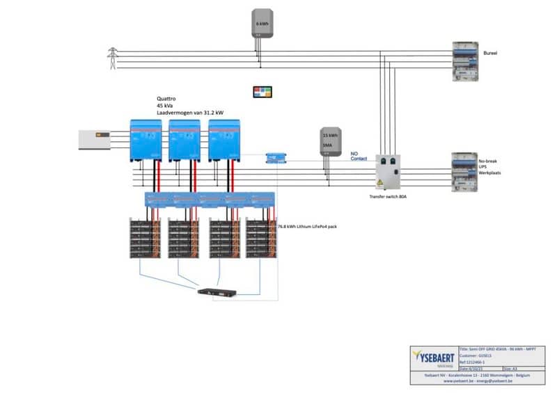 In order to comply with the National Grid power regulations in Belgium, Electrical Engineers Ysebaert.be – who advised and supplied the system components – incorporated a Break before Make transfer switch as seen on the system schematic below. This ensures that the private power system will not become grid-connected.