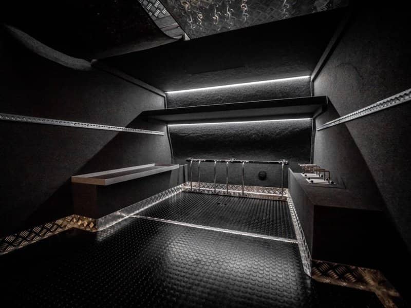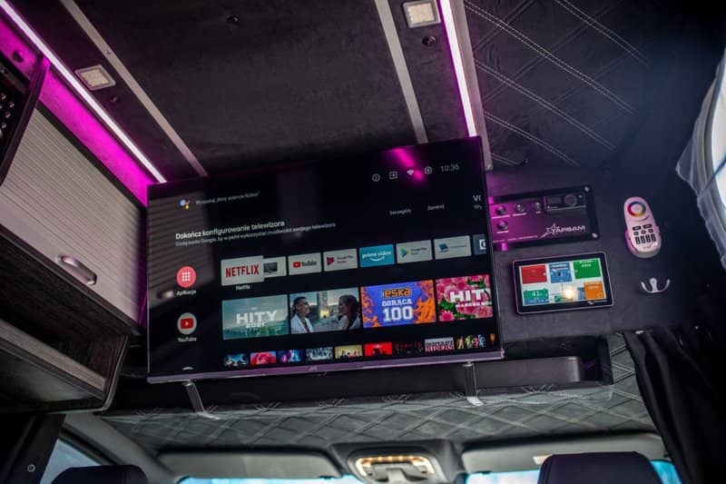 The living space, for example has road-safe sofas, and fold-out beds capable of providing overnight accommodation for 5 or 6 people. There’s TV entertainment, game consuls, air conditioning, and IT chargers with a fridge and coffee maker in the kitchenette.