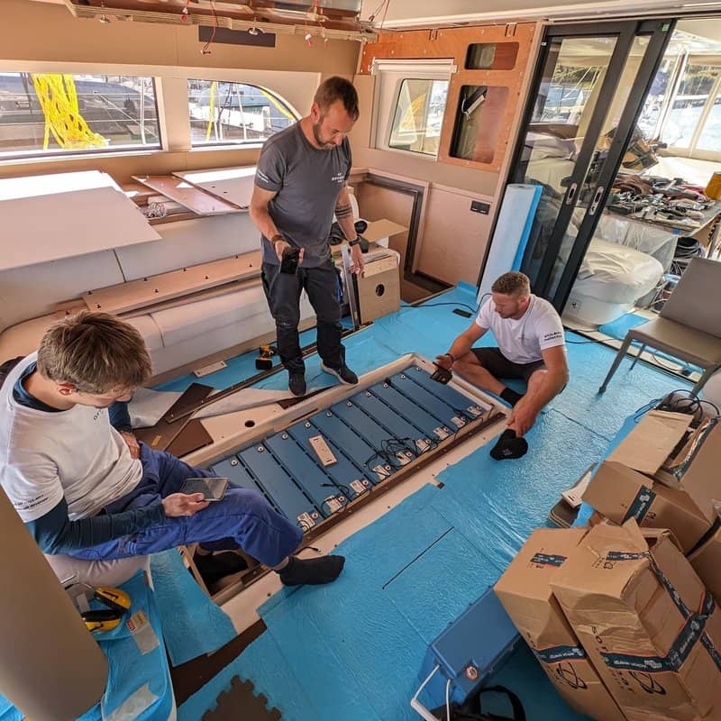 The Lagoon SIXTY 5 sailing catamarans incorporate one or two diesel generators in their on-board power system. We regularly equip these vessels with a large customised solar system; up to 4x 150A alternators mounted on a custom-made bracket with 4x Wakespeed alternator regulators; lithium battery storage system, and high-performance inverters.