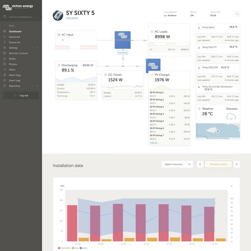 On board energy management is automated and optimised with Victron Energy equipment so that even large power-consumers – such as the air conditioning system – can be operated without noisy generators.
