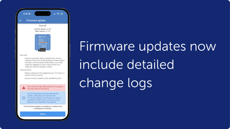 With VictronConnect v6.30, firmware updates now show release notes directly in the update screen, making it easier to see what has changed before updating. The release notes remain visible during the update process, giving clearer insight into each firmware version.